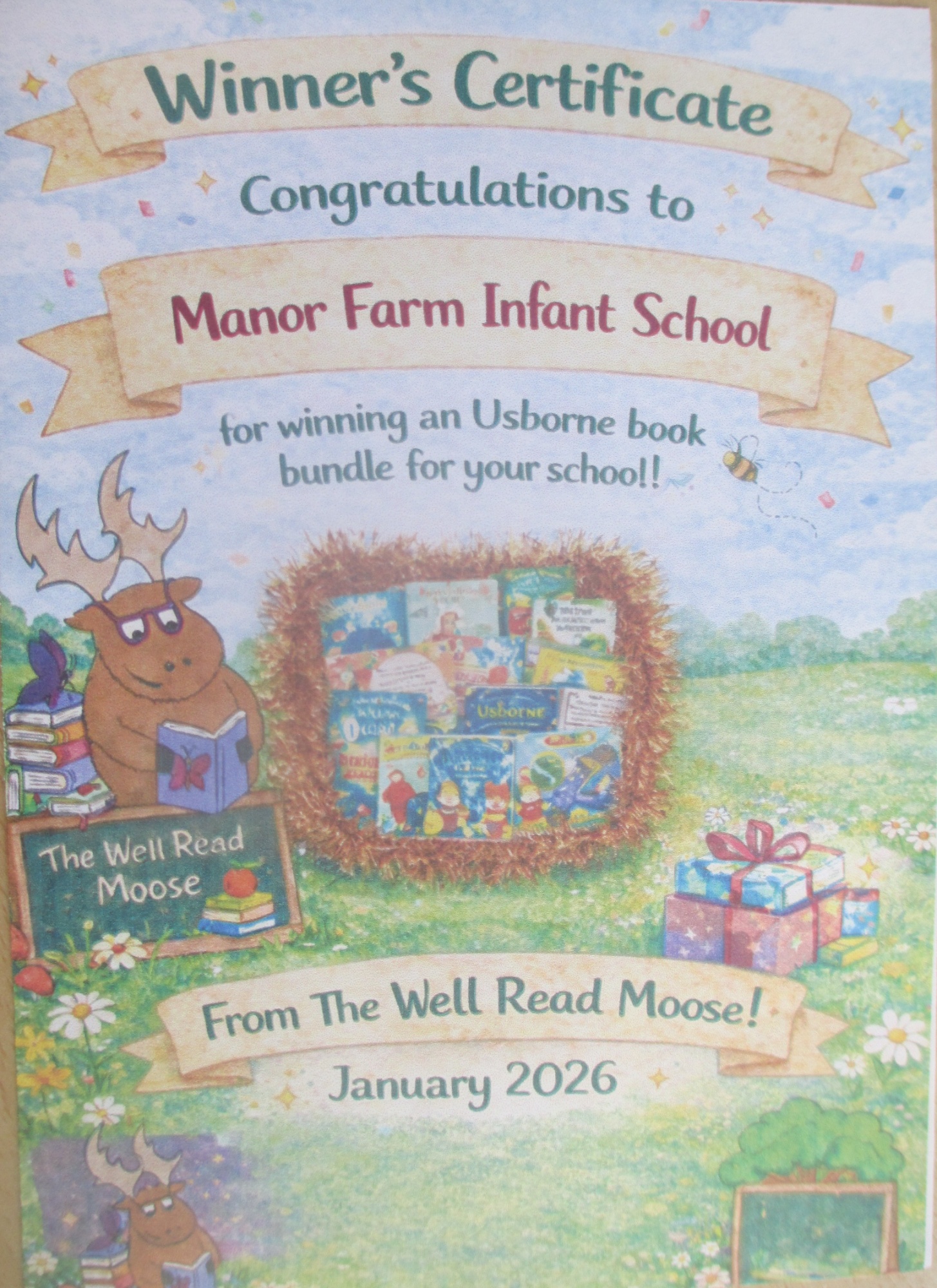 A big thank you to 'The Well Read Moose!' and the families and friends of Manor Farm Infant School for winning an Usborne Book bundle for our library. It was a great effort and we really appreciate your support.
